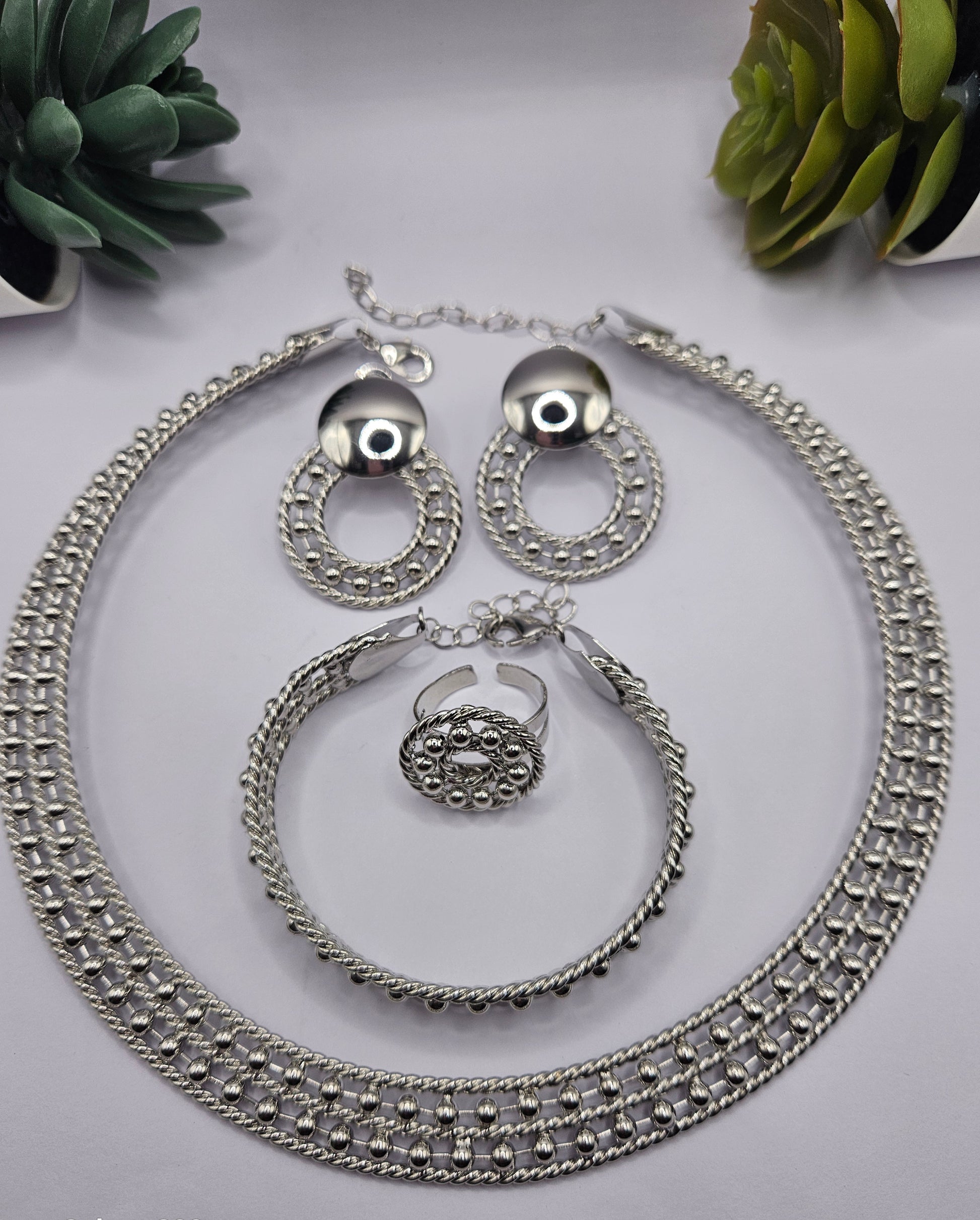 18k Gold-Plated Luxury Geometric Beaded Jewellery Set – Necklace, Bracelet, Earrings & Ring (Gold/Silver F