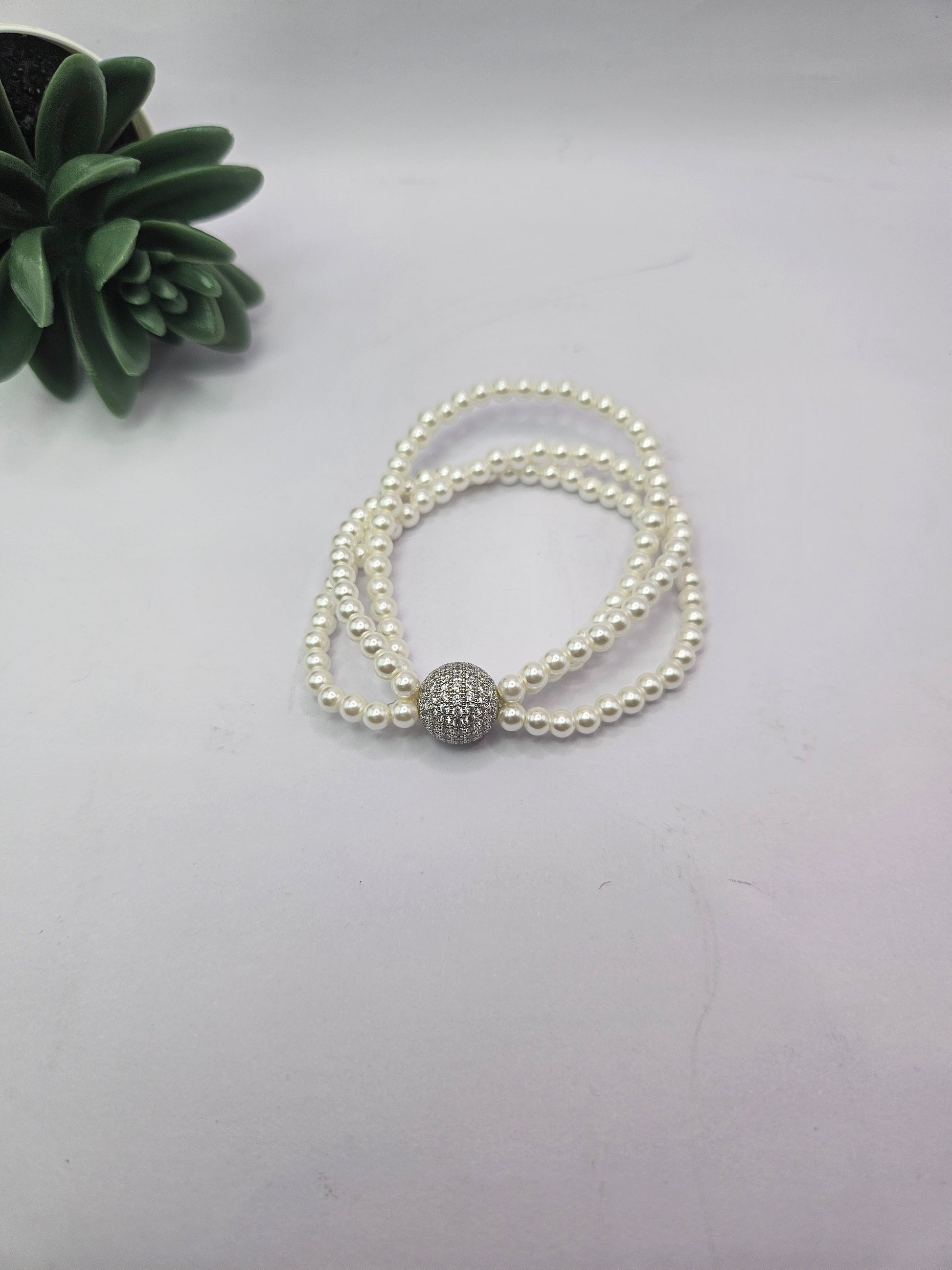 Elegant pearl beaded stretch bracelet with a sparkling crystal accent bead. Classic, versatile, and perfect for adding timeless charm to any outfit.