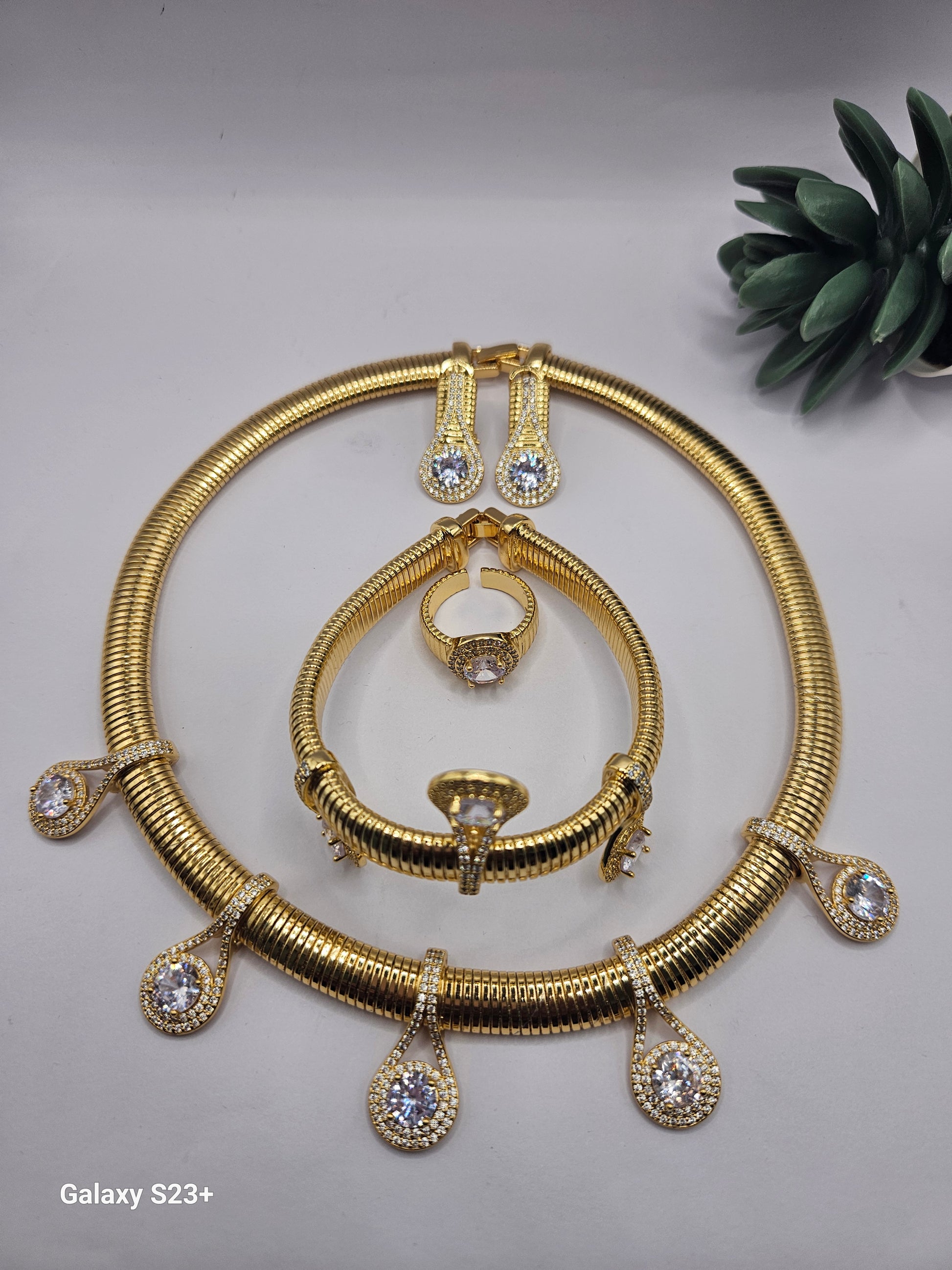 Turn heads at any occasion with our Luxury 18k Gold-Plated Teardrop Crystal Party Set, designed for elegance and sparkle. Each piece is crafted with a sleek coil-style band and finished with dazzling teardrop crystals surrounded by shimmering accents. Perfect for weddings, parties, and special celebrations.